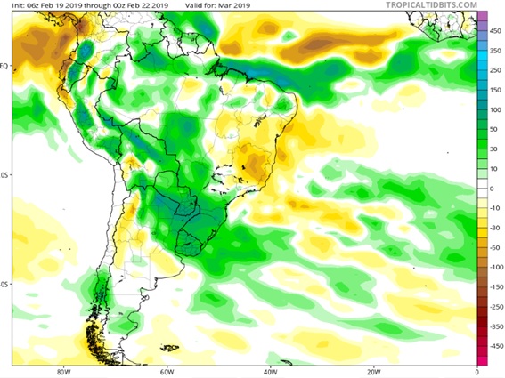 O modelo climático indica que, no mês de março de 2019, o acumulado de chuva resulte em valores acima da média histórica, como mostra o mapa abaixo. A coloração verde sobre o Estado indica acumulado mensal ligeiramente acima da média.
